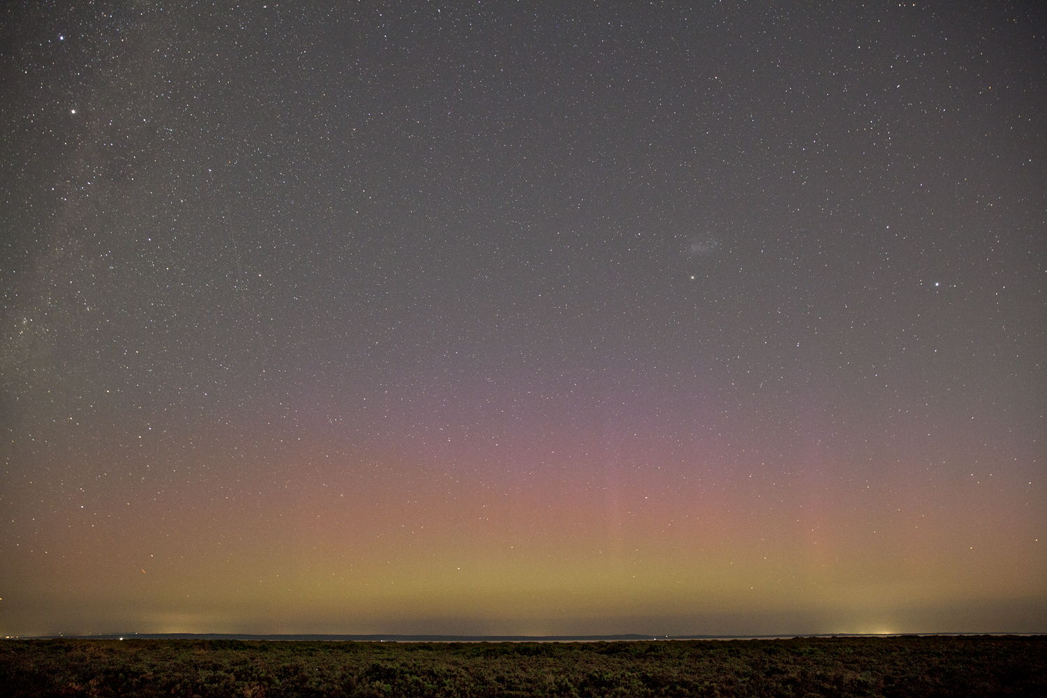 Aurora Australis, Tooradin, 24th April 2023, 6:59pm AEST; in a starry field, a fairly weak presentation of yellow-green arc, reddish glow, weak beaming and violet above. The Pointers are upper left and the Small Magellanic Cloud is right of centre.