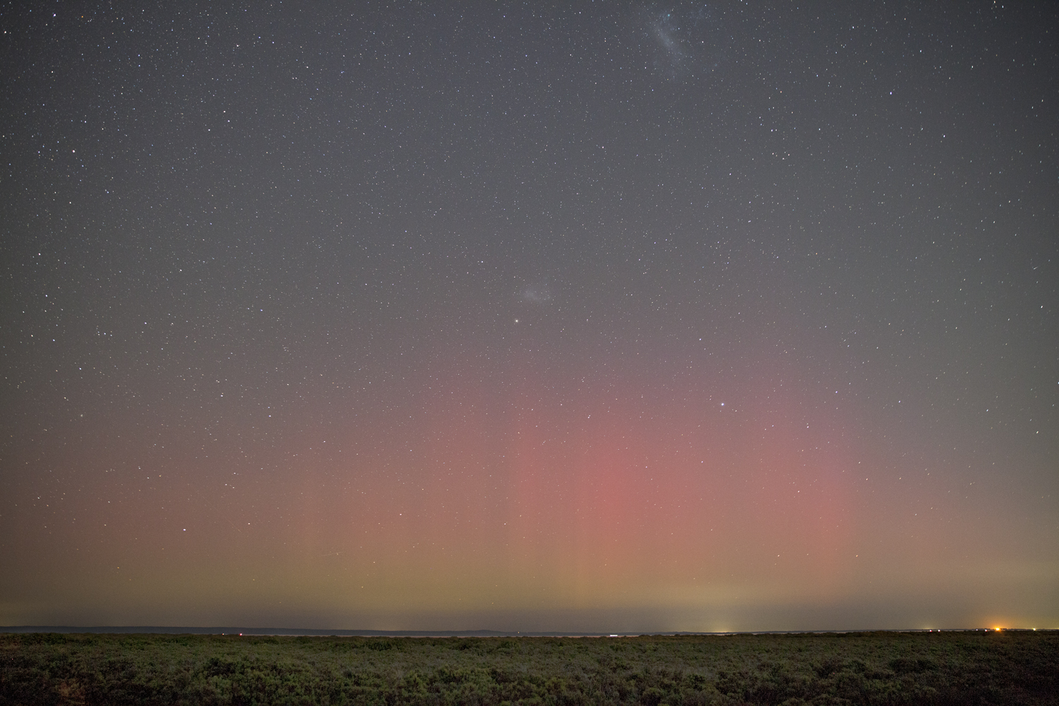 Aurora Australis, Tooradin, 24th April 2023, 8:04pm AEST; looking a little west of south, the Magellanic Clouds add extra interest