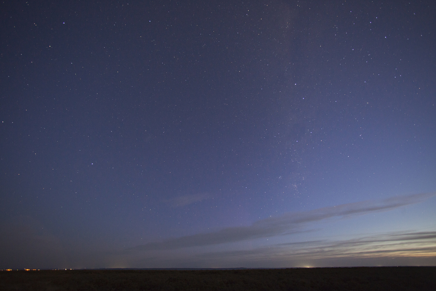 Aurora Australis, Tooradin, 19th September 2023, 7:09pm AEST; in fading twilight and a developing field of stars, weak reddish glow and beams to the south. The Pointers and Southern Cross are middle right of centre.