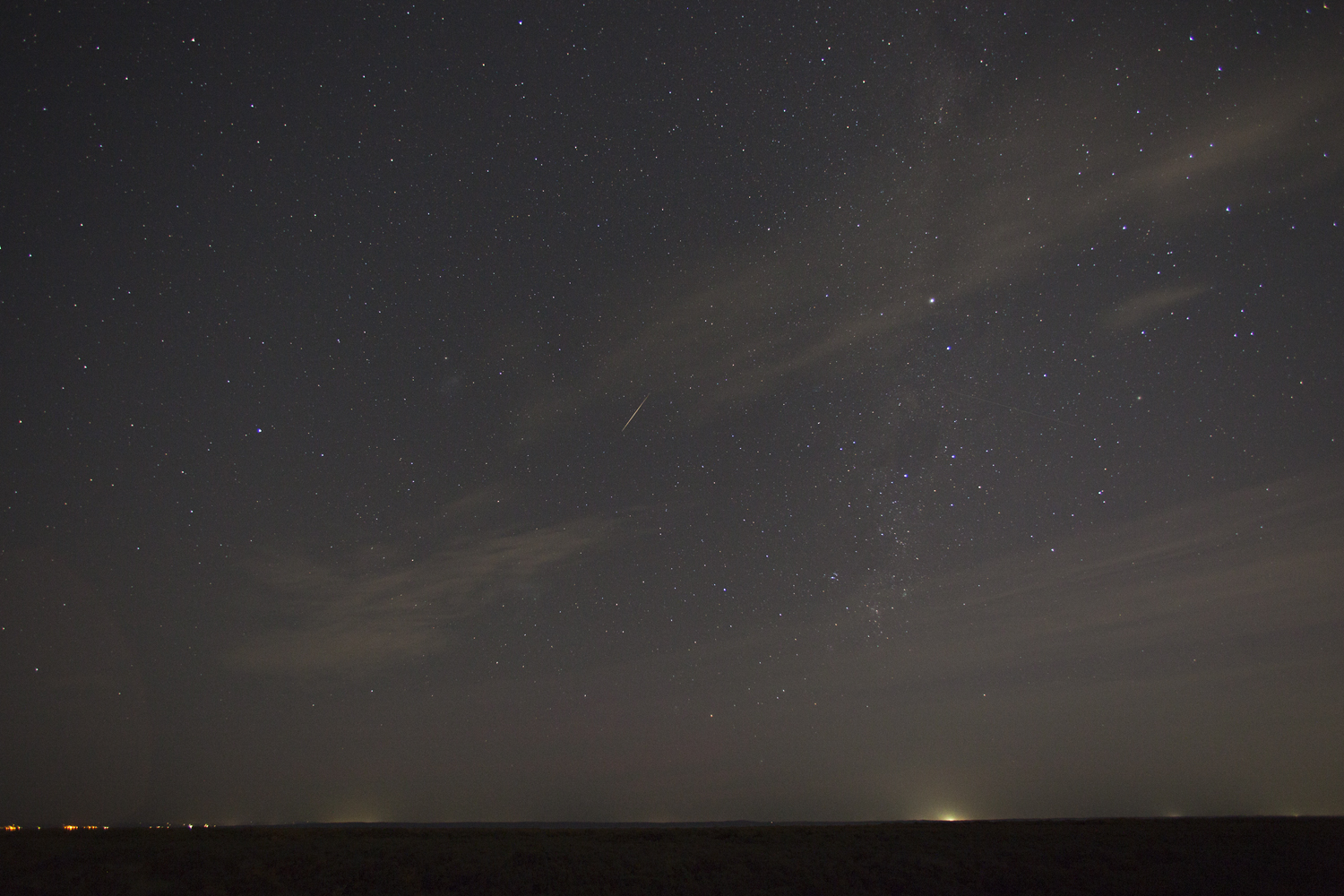 Aurora Australis, Tooradin, 19th September 2023, 7:50pm AEST; the display continues to fade away, almost to nothing. Streaky clouds begin to intrude on what's left of the action - a very weak reddish glow in the southern quarter. A satellite flare appears in the centre of the field, while the Pointers and Southern Cross are middle right of centre.