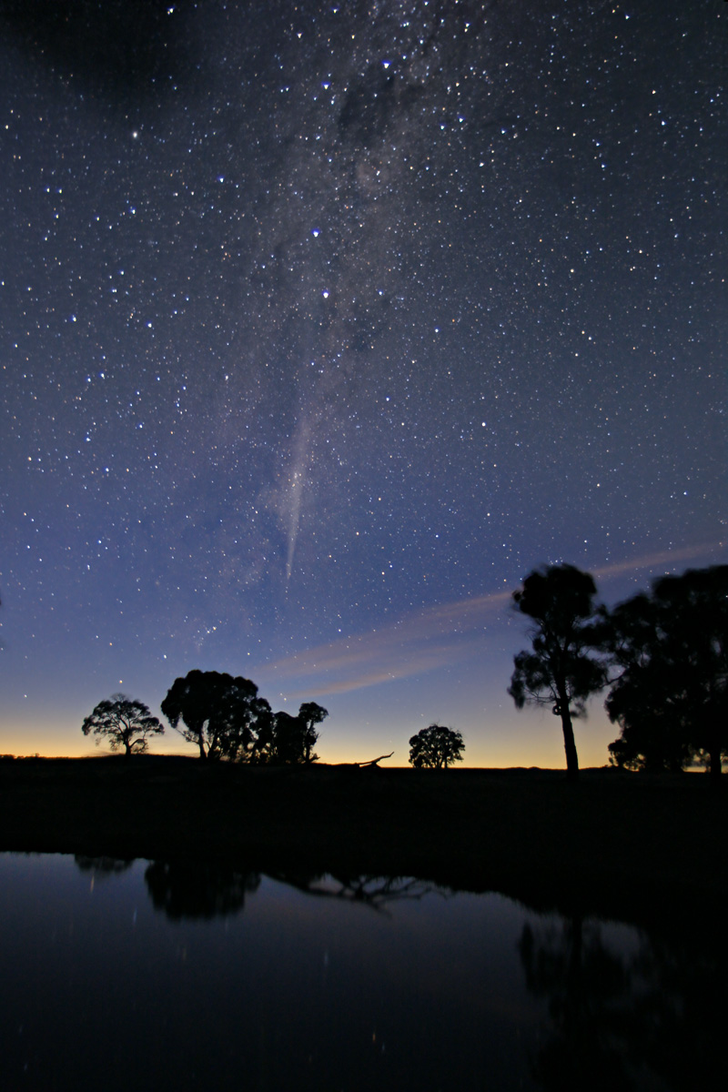 captured here in twilight against the stars of Ara. The "Southern Cross" is at top of the frame; the tail extends for over 35° past "The Pointers". (The dark area top left is a tree branch that "snuck" into the frames.)
