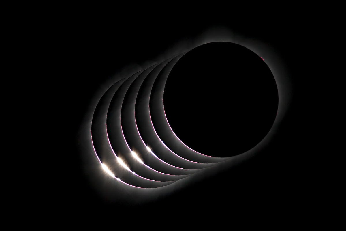 - how quickly the transition to totality occurs; fine examples of Bailly's Beads, the thin red band of the chromosphere, the inner corona and numerous delicate prominences are presented