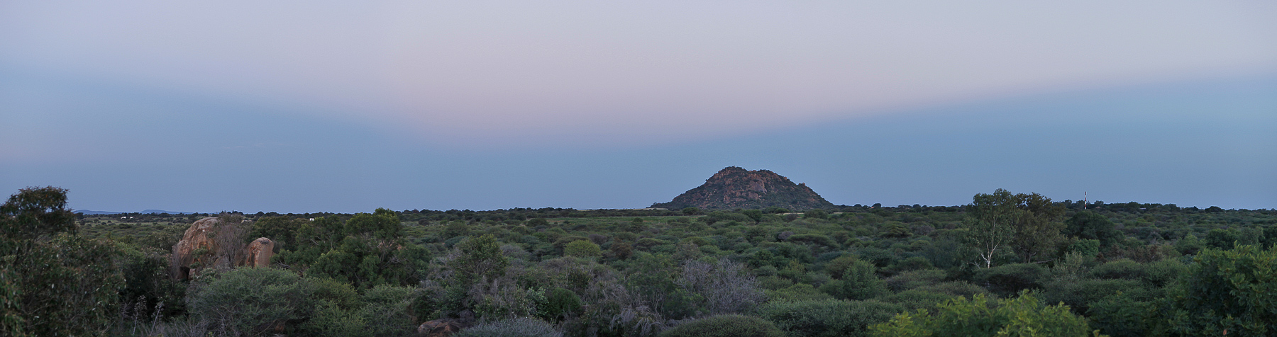 A panoramic view looking East at sunset. Flat countryside with a few hills dotted about
