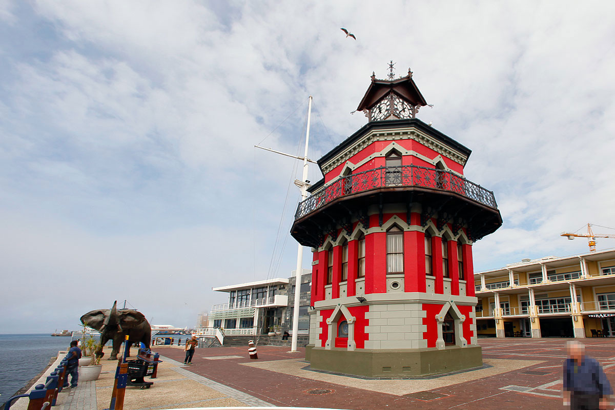 Cape Town's Victoria & Albert waterfront clock tower - a wide angle view with corrected perspective