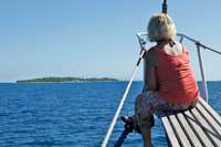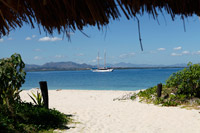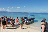 Disembarking to enjoy four relaxing hours on the island | A view of Viti Levu and the schooner from the island | |