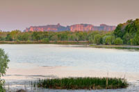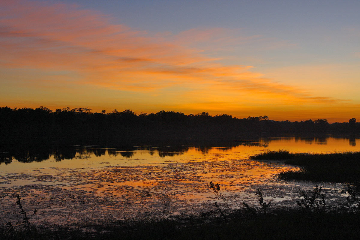 Looking southeast over Lake Jabiru at sunset showing the lake and the stunning colours of the escarpment at Gubara