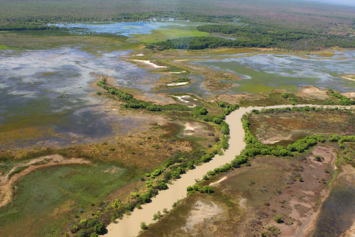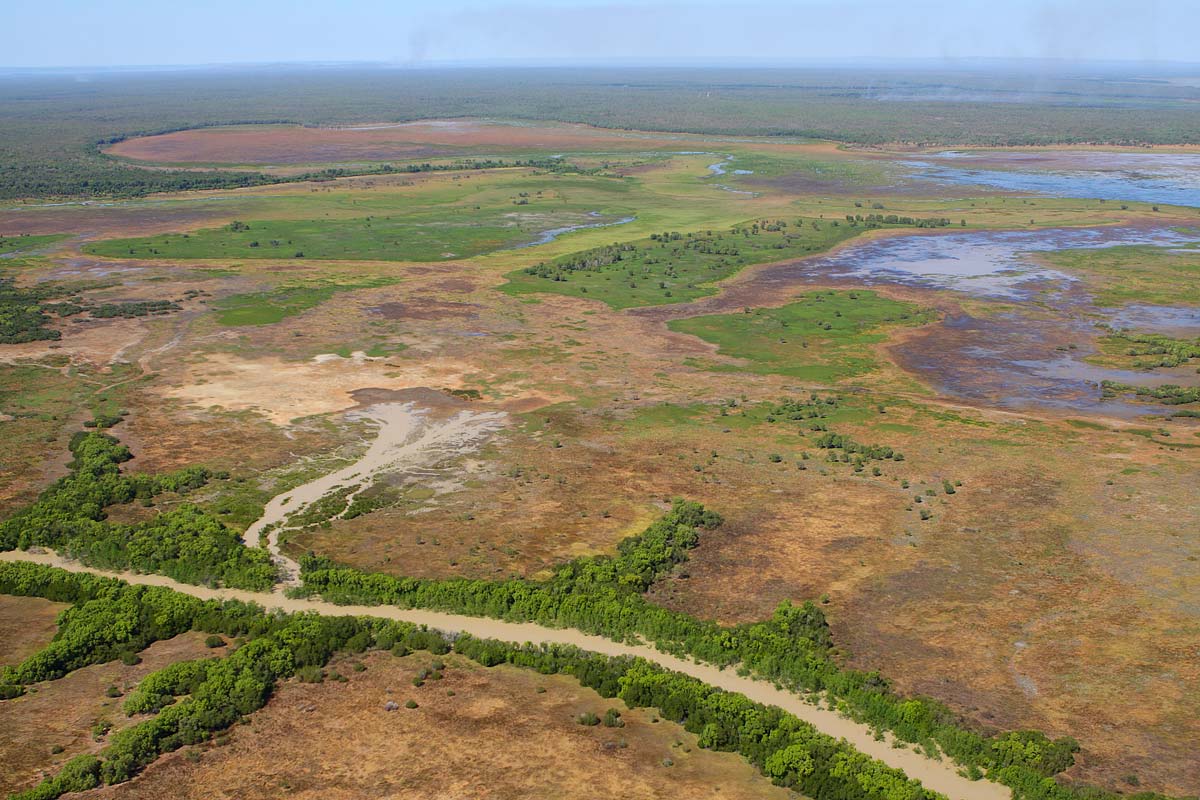 Contrasting waters in the Kakadu wetlands. Note the smoke in the distance produced from scrub burning off