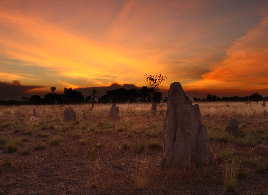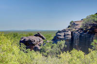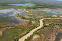 Kakadu National Park, 171 km southeast of Darwin, is located within the Alligator Rivers region of the Northern Territory and covers an area of 1,980,400 ha (4,894,000 acres) extending nearly 200 kilometres from north to south and over 100 kilometres from east to west, approximately one-third the size of Tasmania. It is Australia's largest National Park and was declared in stages from 1979 onwards. It seems incongruous that the Ranger Uranium Mine, an open cut mine and one of the most productive sources of uranium in the world, is contained within the Park, but it pre-dated establishment of the Kakadu area as National Park. It is a requirement of the mining lease that when the mining is finished the hole will be back-filled with stored material to return the land to "original" condition. Jabiru, a small town within the Park, was originally created to provide accommodation and services for the mine employees. It remains as such, but now also provides high quality accommodation for the tourist - a very unusual situation for a National Park - and an enviable easy access to all areas of the Park, which abounds with natural beauty and wildlife.