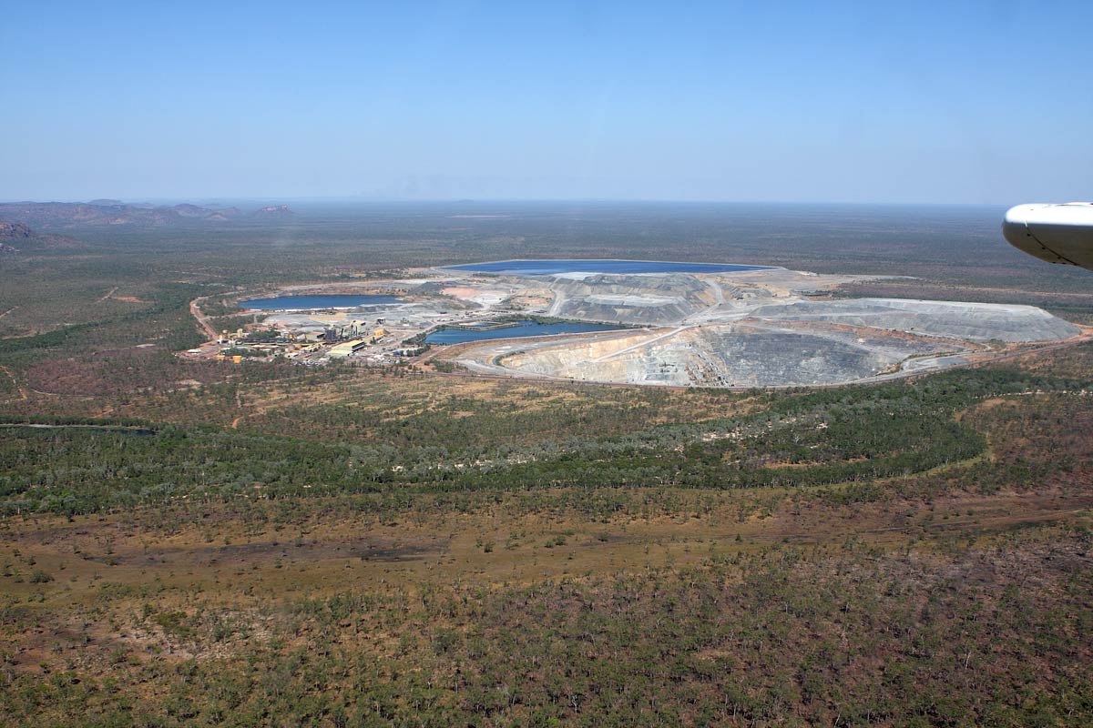 The Ranger Uranium Mine from the air. Huge mounds of rock are stored to back-fill the holes when mining is finished.