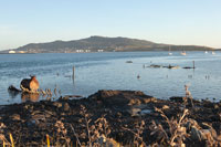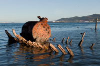 | The "Ship's Graveyard" near Bluff with the town and hilly peninsula in the distance. Wooden ships were scuttled here and left to rot. Wrecks of five vessels are visible in this image | |
