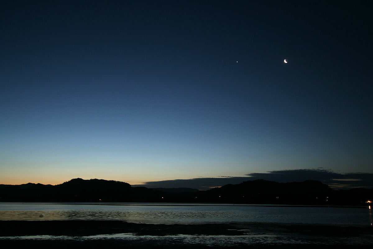 | A beautiful evening twilight scene containing the crescent Moon, Venus to the left and Jupiter just above the hill lower left. | |