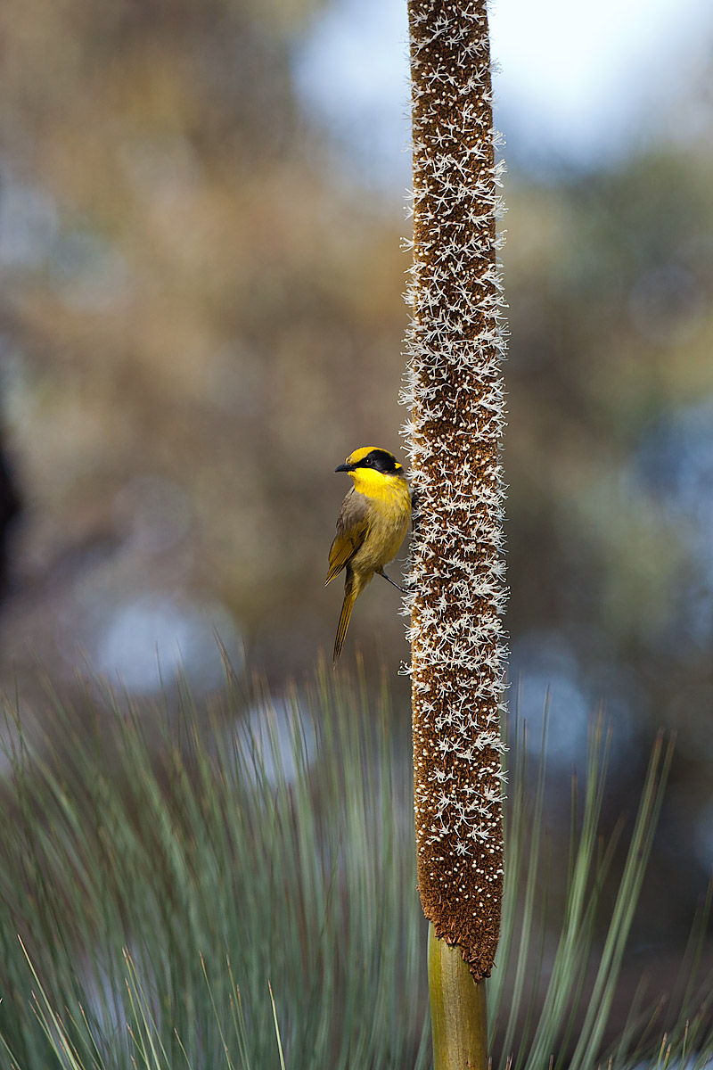 Yellow-tufted Honeyeater on Grasstree Flowerhead