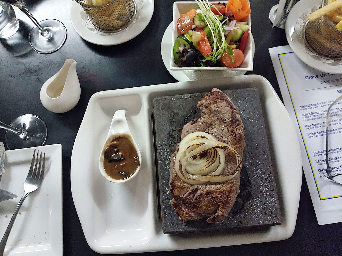 Raw steak cooking at the table on a rock heated to 400°C. With mushroom sauce, salad and fries. Yum, cooked rare-medium, just the way I like it!