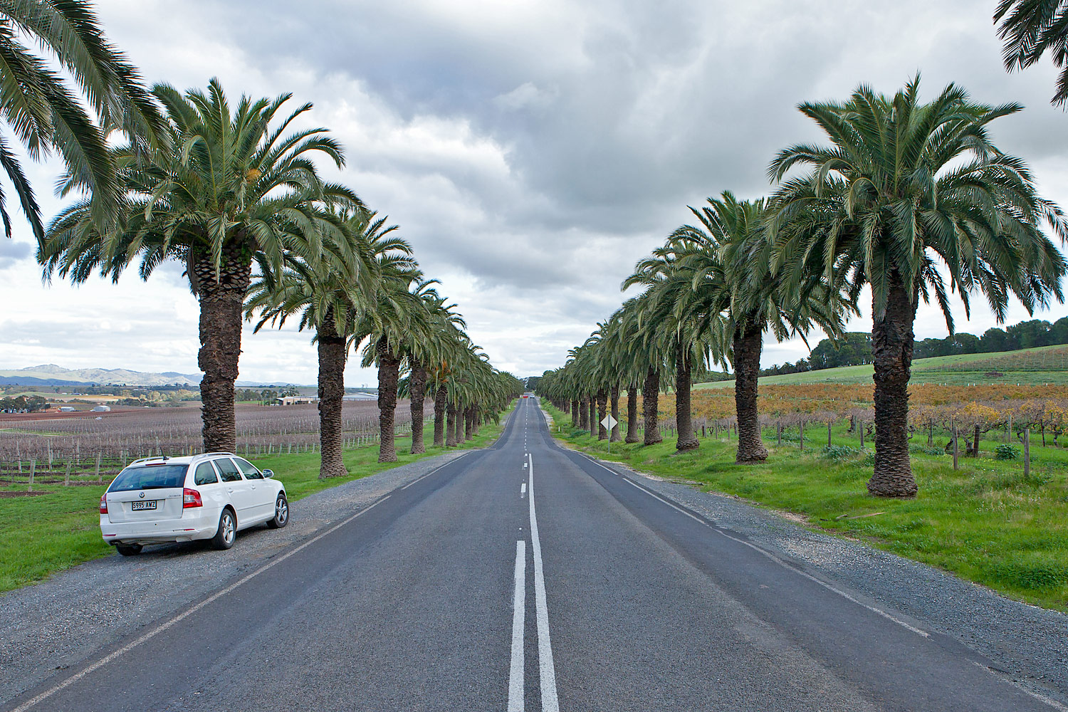 The date palm-lined road to Seppeltsfield, the oldest winery in the Barossa Valley