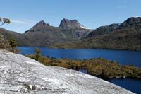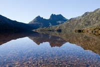 The beautiful Cradle Mountain looming over the peaty waters of Dove Lake |