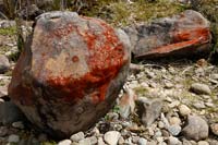 Lake St Clair | Eye-catching red lichen-covered rocks on the shore of Lake St Clair | |
