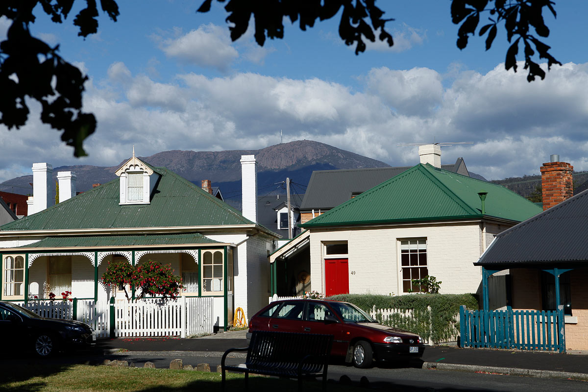 Homes in Arthur's Circus overlooked by Mt Wellington