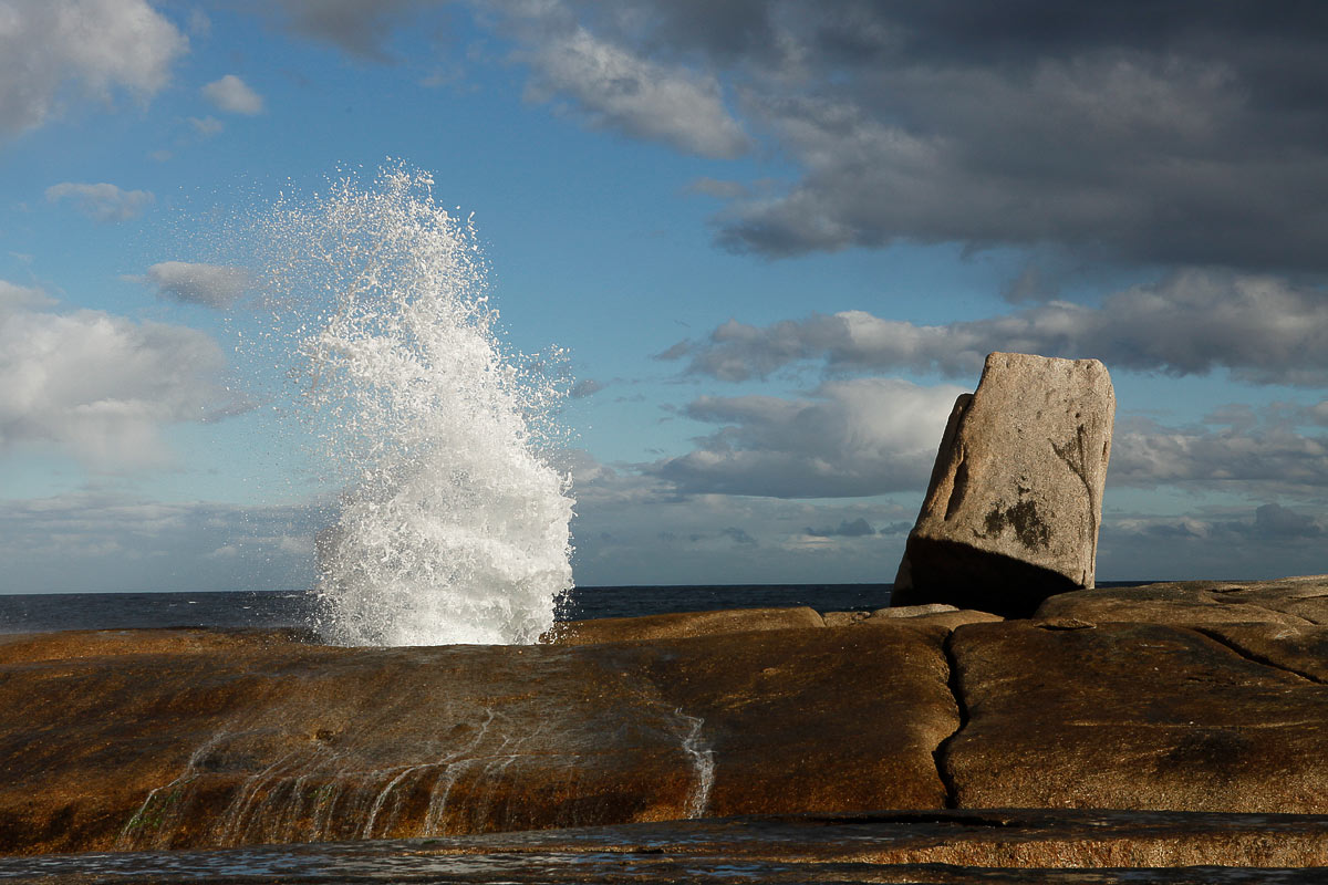 The blowhole at Bicheno captured in action in sunshine despite looming storm clouds.