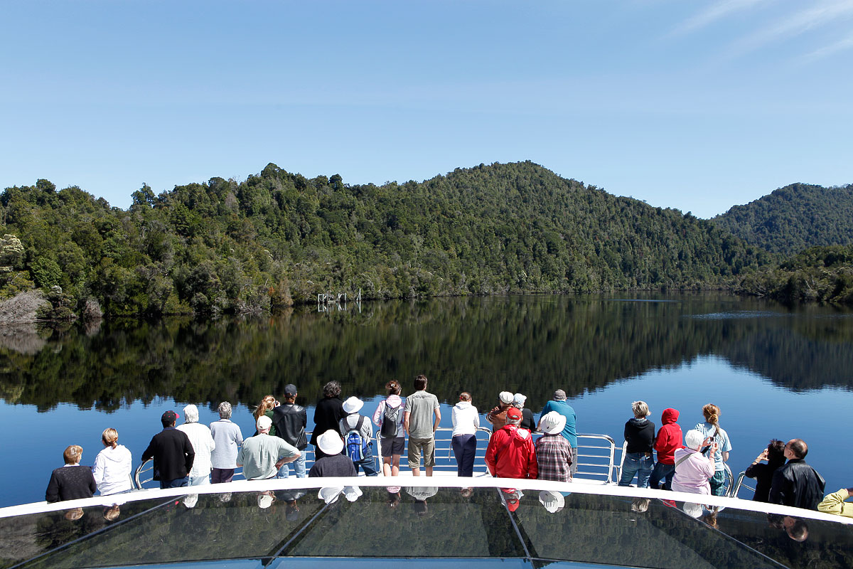 A large number of lucky people cruising on the Gordon River; more superb reflections