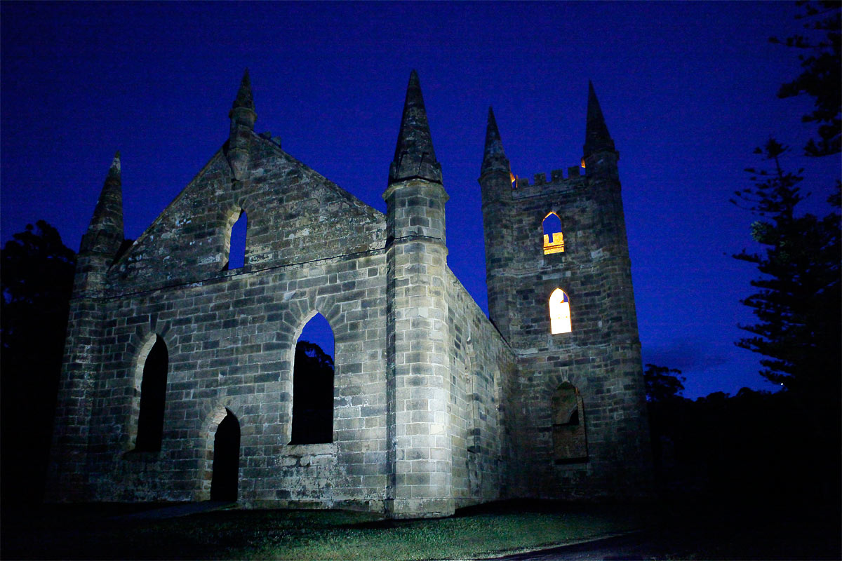 The ruined church seen in twilight during the ghost walk.
