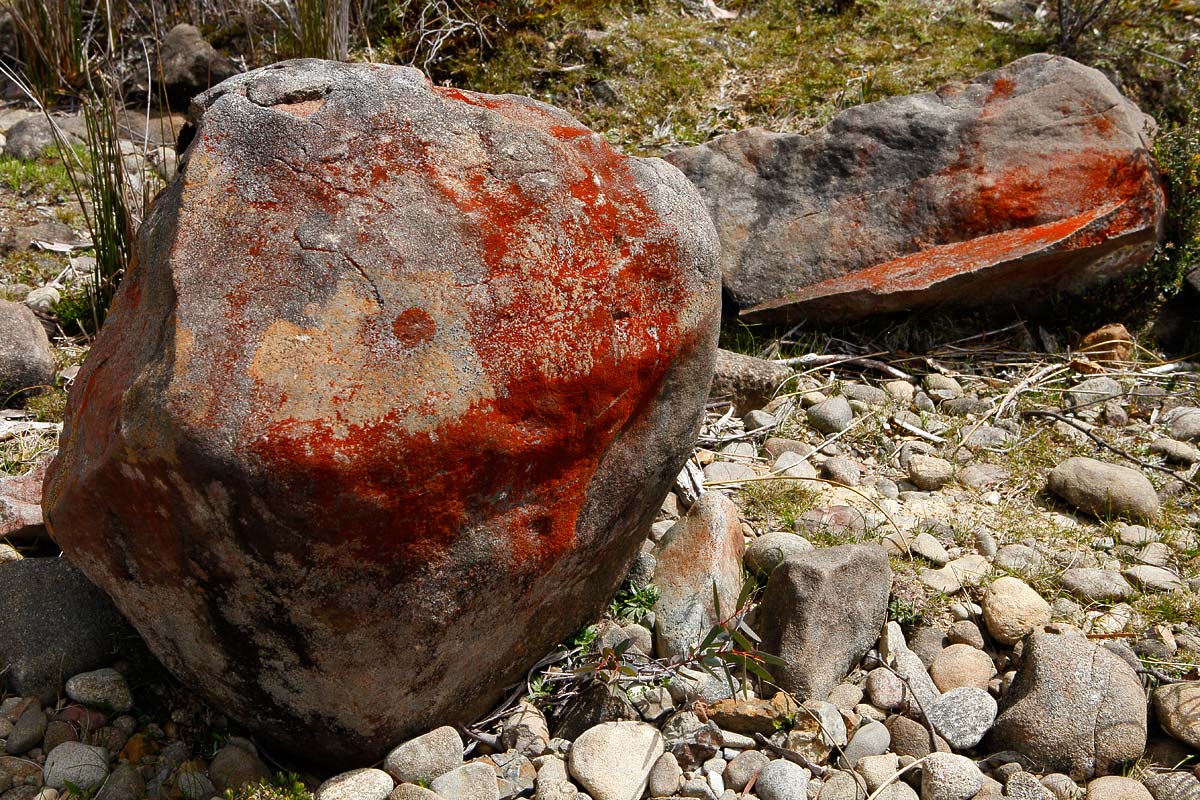 Red lichen-covered rocks really caught the eye beside Lake St Clair.
