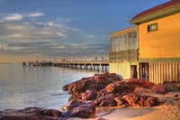 | Late afternoon sunshine on the pier and cafe at Cowes, Phillip Island. | |