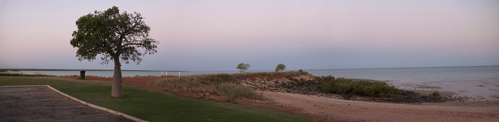 A panorama of Town Beach at sunset, but looking the other way. The "Belt of Venus" rises over the horizon in the direction opposite to the sun