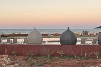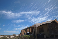 | Dining tables at Sal Salis. Opulent foodie experience of the highest order | Whale-shark symbolism is a prominent feature in the Exmouth region | Sal Salis: glamping in style under beautiful skies - day and night | Beautiful sunsets were a feature: crepuscular rays over the Indian Ocean |