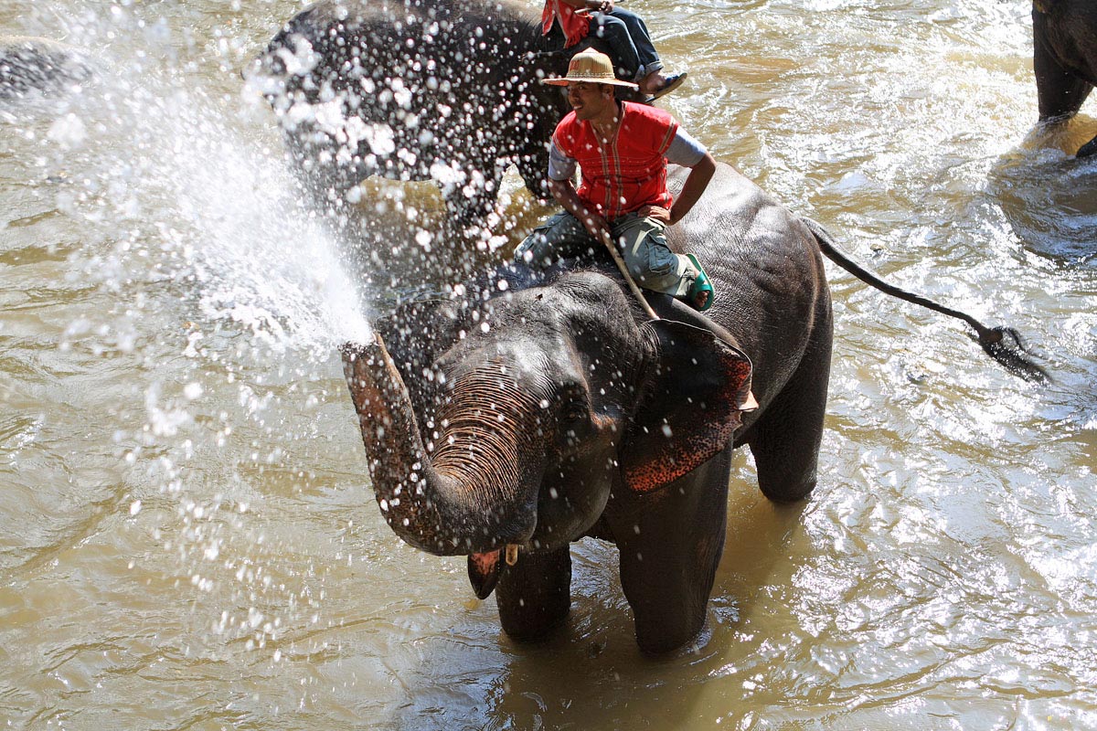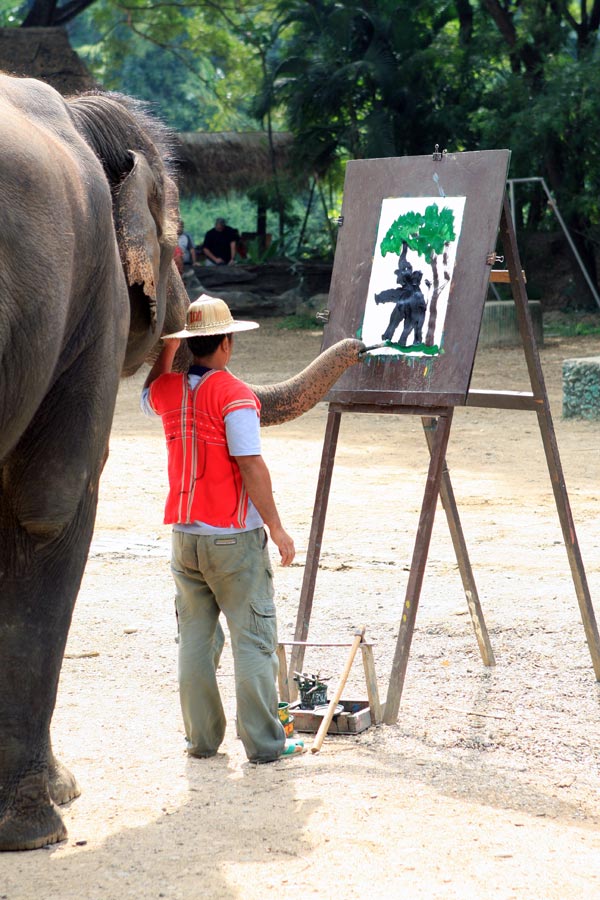 | An enjoyable day was spent visiting an elephant park. You get a free shower too! Here's another of elephants enjoying the water. One doing a trick and one painting. | |