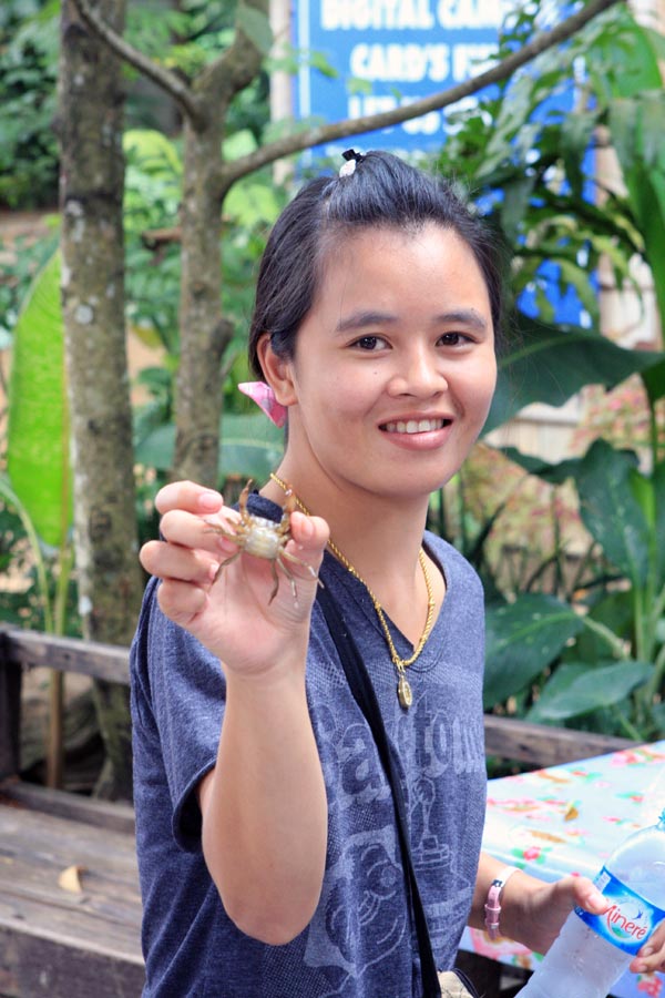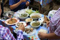 | A typical rural home cooked meal. Not everything is cooked - eating live crabs is a delicacy. | |