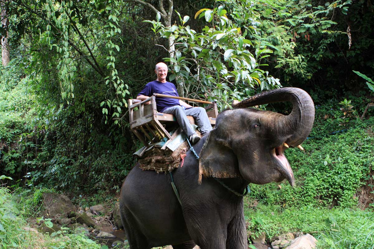 | Here I am riding an elephant. An interesting ride done at a very leisurely pace. OK going uphill, but hang on going down! | |