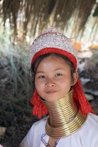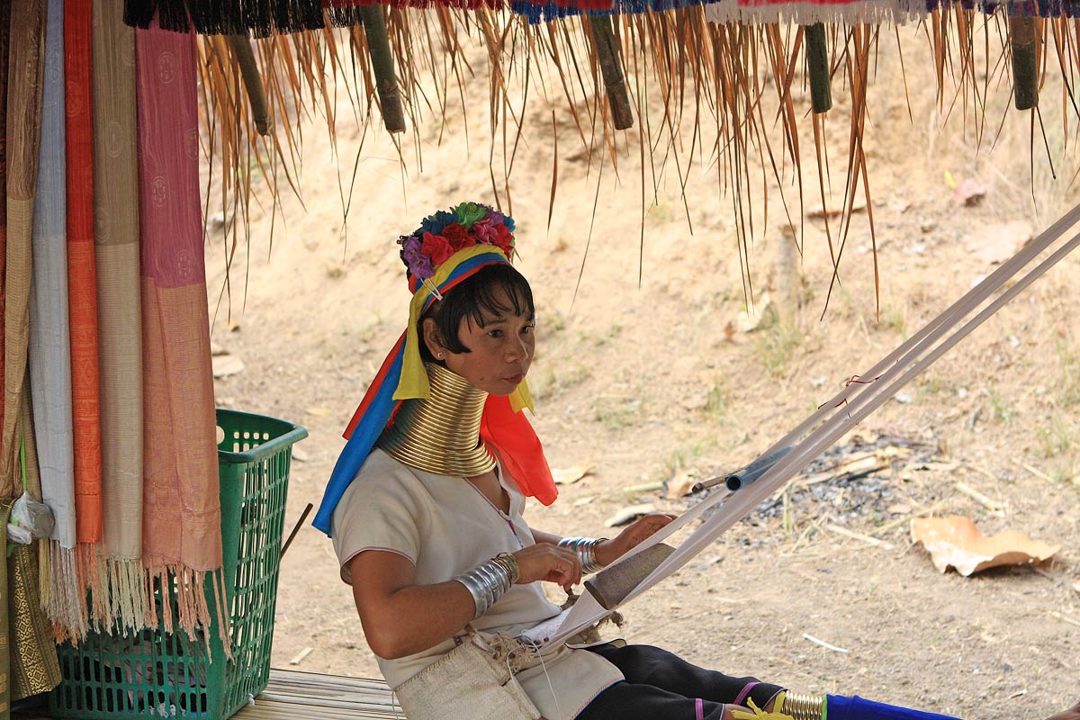 | A long-neck girl. The brass rings were originally applied to protect Burmese women from tiger attack. Now the long neck is a very desirable characteristic. Here's a long-neck woman working a loom. |