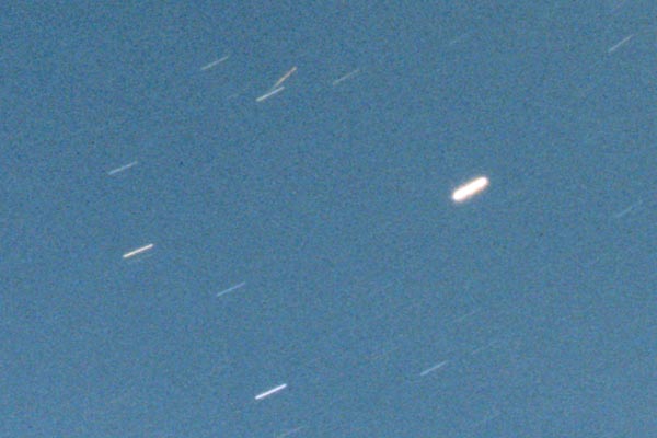 | A close-up of a five minute exposure commencing at 04:40 UT through a 16mm lens at f/2.8. One bright Leonid is visible at the top of the frame. | |