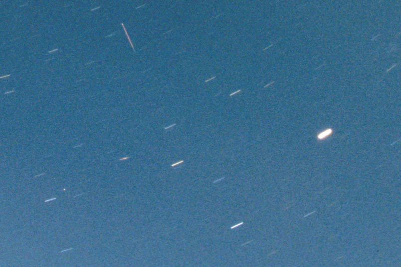 | Ten minute exposure commencing at 05:08 UT through a 16mm lens at f/2.8. A fireball (and part of my car) is captured in the bottom of the frame low on the horizon. |