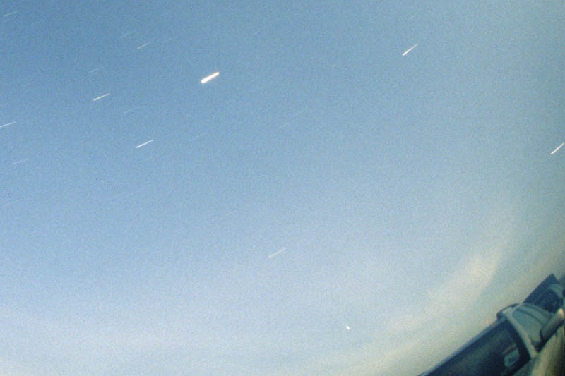 | A four minute exposure commencing at 04:46 UT through a 16mm lens at f/2.8. In this close-up view two reddish Leonids are caught streaking away from the radiant. This image was also featured as the BAA "Picture of the Week" for the 2/12/02. | |