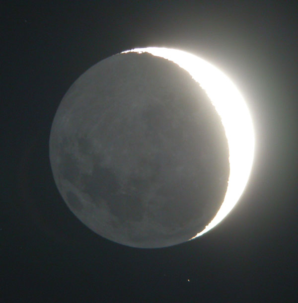 24 day moon with prominent earthshine. Imaged on the 23rd September 2003 by eyepiece projection from a 15cm f/4 RFT into a Nikon CoolPix 4500 digital camera. The star at bottom right is BSC 3869, mag 6.5.