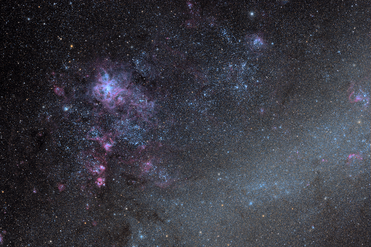 The Tarantula Nebula and Environs - The Large Magellanic Cloud A spectacular region of our southern skies inside the Large Magellanic Cloud featuring the Tarantula Nebula, fields of young blue supergiants, star clusters, emission and dark nebulae, thousands of stars and the central "bar" of the galaxy. Awesome! Distance: 165,000ly.