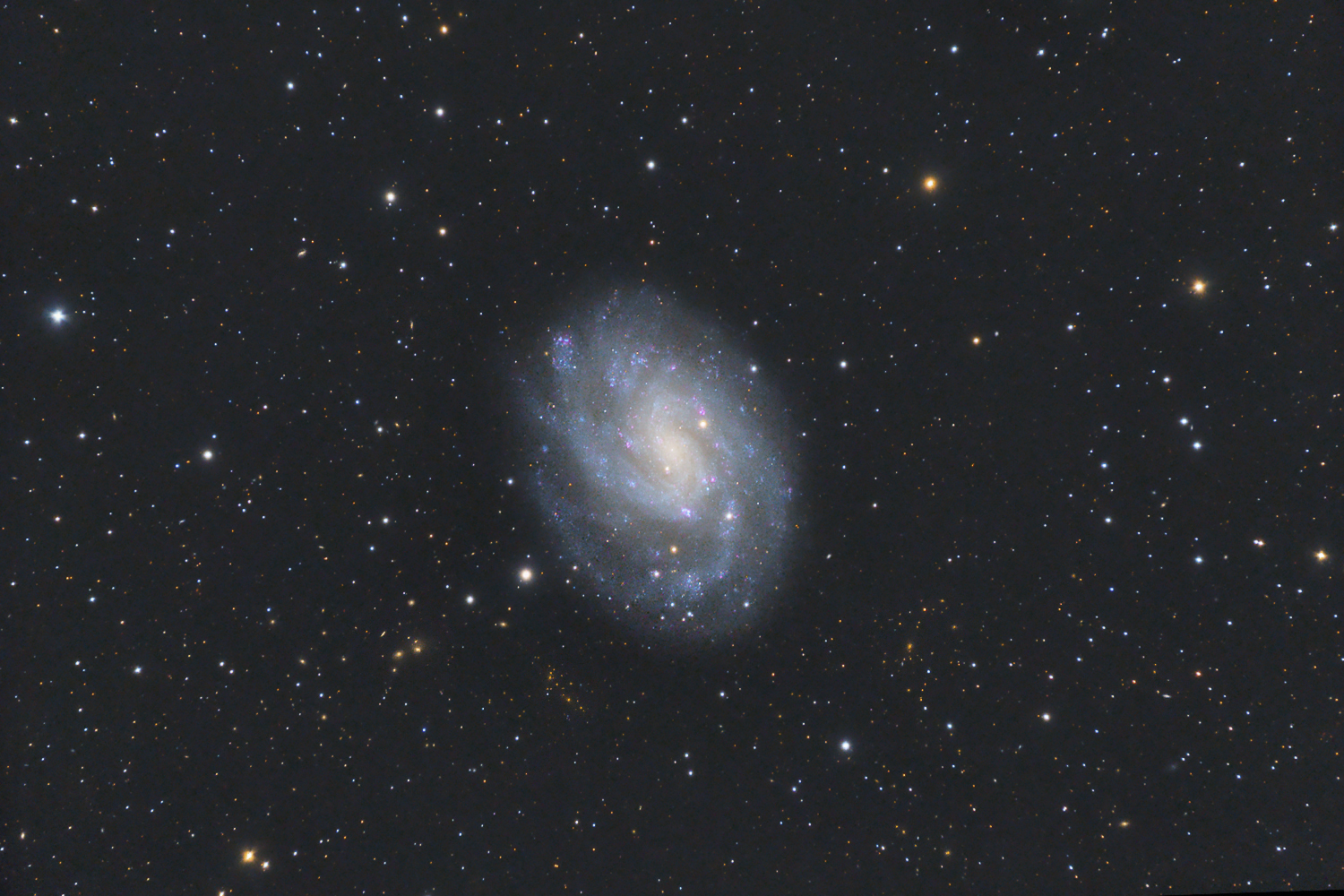 Spiral Galaxy, NGC 300 Located in Sculptor, it is one of the nearest galaxies to our Local Group at around 6 Mly. Seen in a starry field and angled obliquely to us, it is about 94,000 ly across putting it somewhat smaller than the Milky Way. It shares many characteristics of the Triangulum Galaxy, M33, in having tightly wound spiral arms containing numerous reddish star-forming regions and clusters of young blue stars. Also, little dust is apparent. The many small fuzzy yellow-orange objects in the field are very distant galaxies and galaxy clusters.