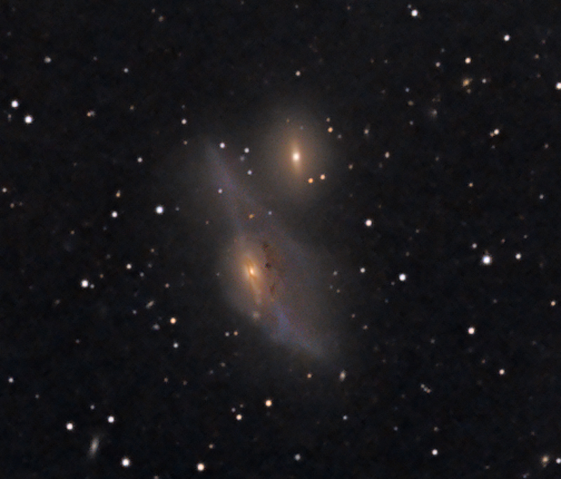 Interacting Galaxies NGC 4438 and NGC 4435 (Arp 120) It is likely that the distorted shape of NGC 4438 was the result of a close encounter with NGC 4435 (and possibly M86) many millions of years ago. Both galaxies contain populations of old yellow stars colour whilst the outer regions of NGC 4438 are distinctly blue, an indication of a second population containing hot young stars. The tidal interactions caused a burst of star formation and disruption of an equatorial dust lane into a series of dark patches. There is also a dust lane running through the core of NGC 4438. Curiously NGC 4435 does not appear to have suffered much disruption during the encounter; distance ~55Mlys. |