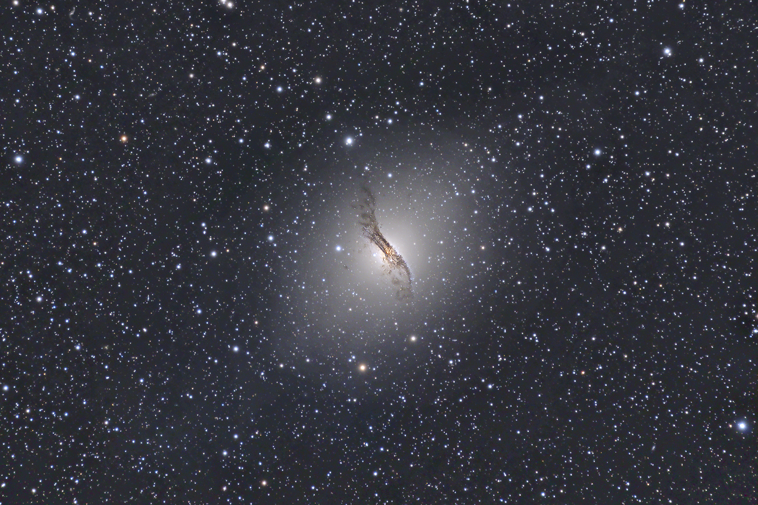 Centaurus-A, NGC 5128 - a peculiar galaxy thought to be two galaxies in collision and a very strong source of radio emission: distance approximately 9MLy.