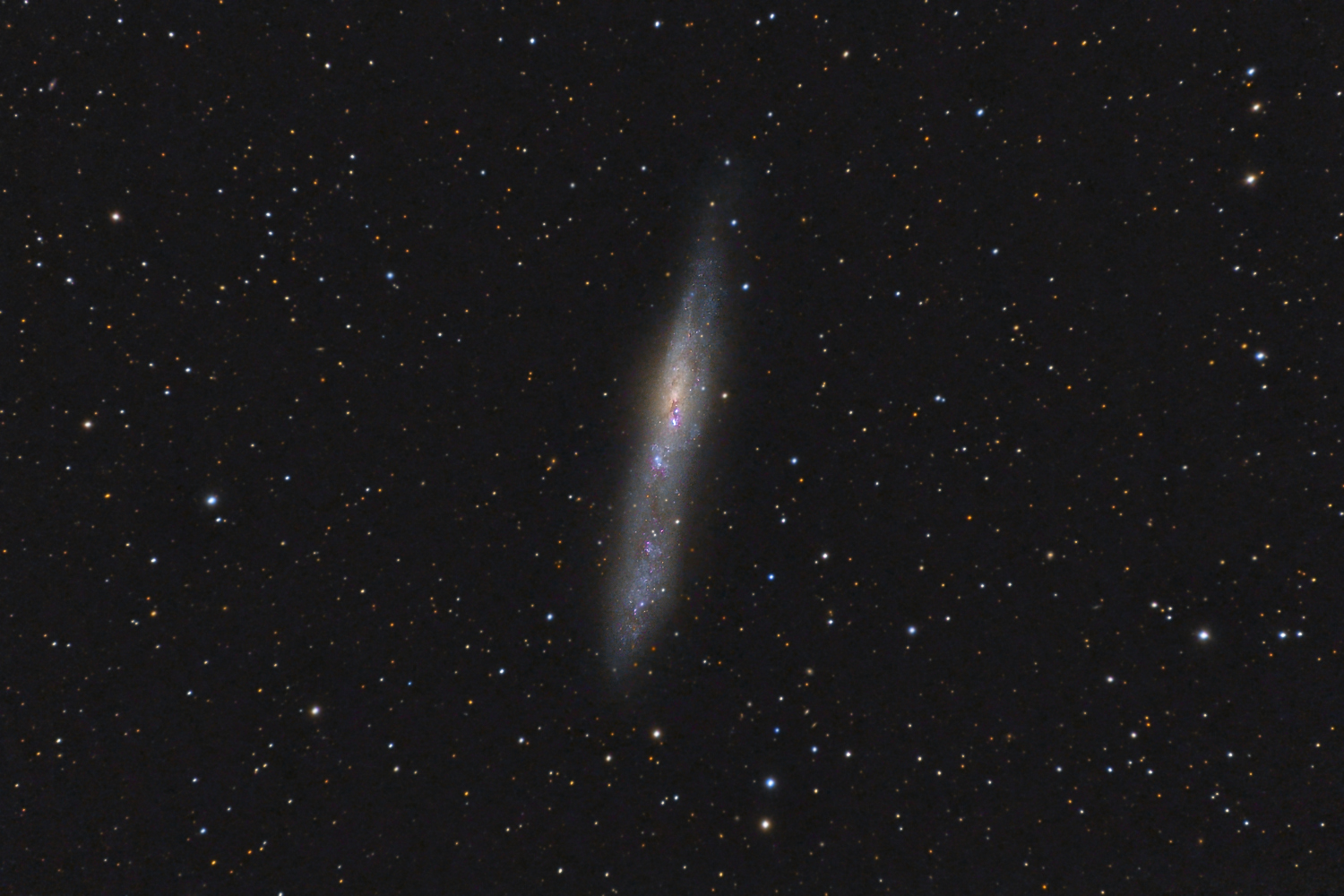 Irregular Barred-Spiral Galaxy, NGC 55 Located in Sculptor, close to NGC 300, with which it is likely gravitationally bound, it is one of the nearest galaxies to our Local Group at around 6.5 Mly. It is seen here in a starry field almost edge-on to us. Its designation as a Magellanic-type barred-spiral galaxy is based on a structural similarity to the Large Magellanic Cloud, LMC. It is clearly asymmetric in having a bulge of older yellowish coloured stars towards one end, but also many reddish star-forming regions and clusters of young blue stars along its "equatorial" region. Little dust is apparent.