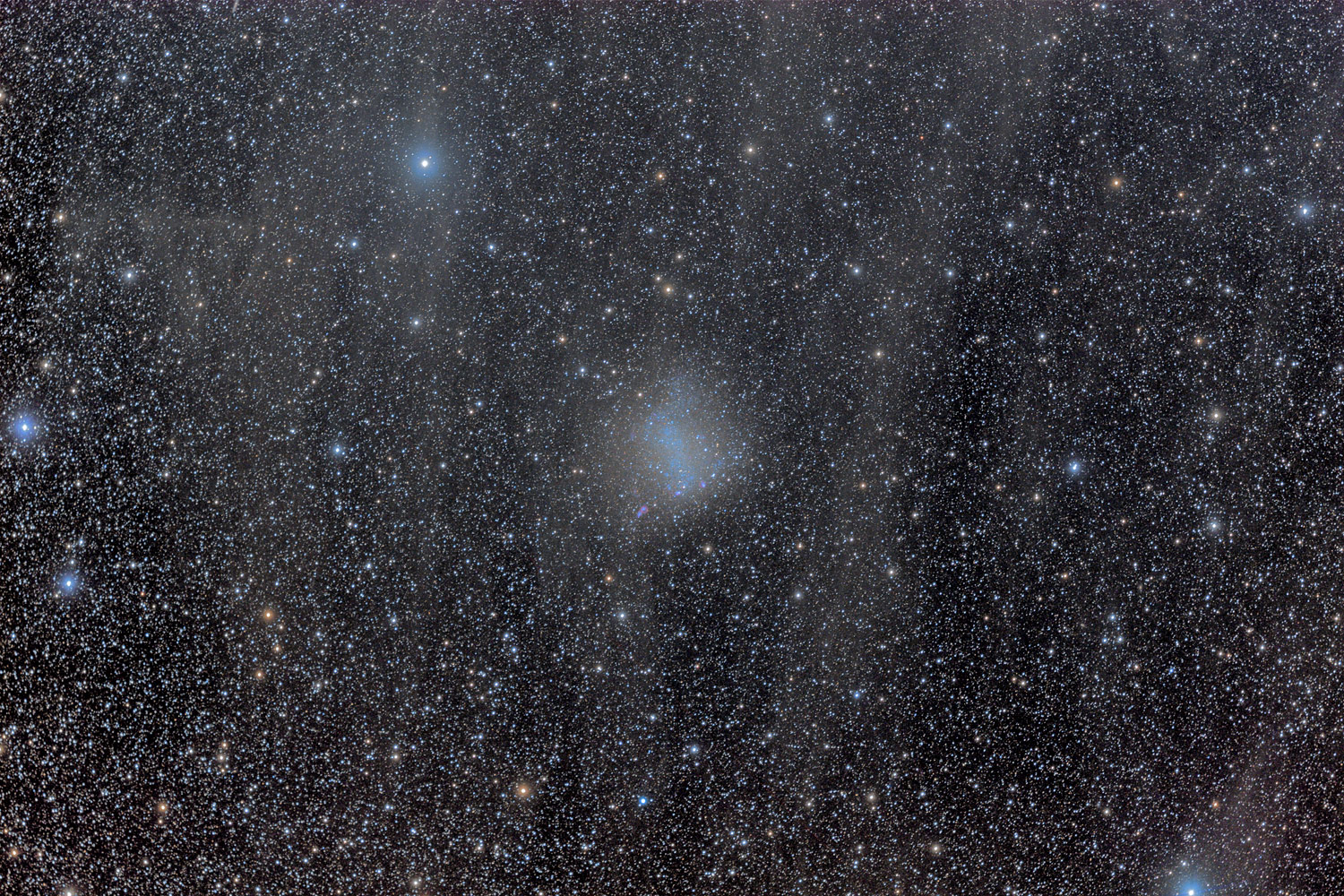 NGC 6822, The Sagittarius Dwarf Galaxy An irregular galaxy and member of our Local Group, NGC 6822 lies roughly 1.6Mly away and close to the plane of the Milky Way. It was discovered visually in 1884 by E. E. Barnard using a 5" refractor and has a strong resemblance to the Magellanic Clouds, both visually and structurally. Like these it contains a similar stellar population of hot young giant stars (brightest at around 15th magnitude) and numerous star-forming regions glowing red (several are visible in the image). The field also contains faint wispy nebulosity which is cosmic "cirrus" of our own Milky Way galaxy.