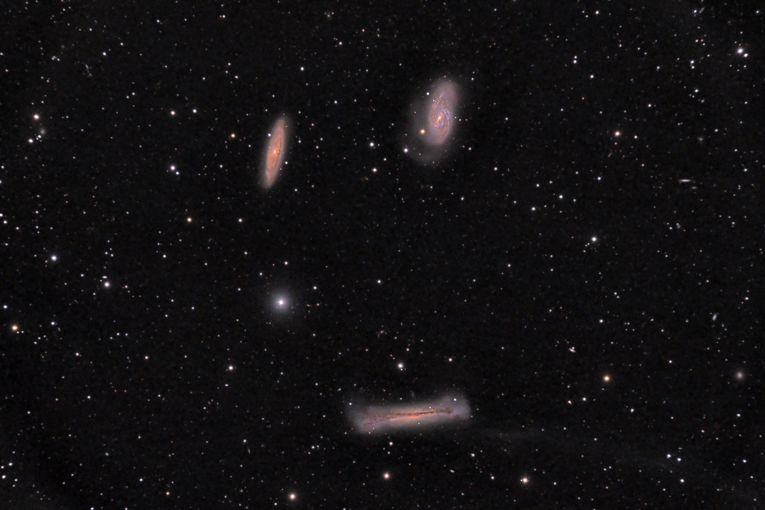 The Leo Triplet of Galaxies, M65, M66 and NGC 3628 Leo abounds with interesting little groups of galaxies set amidst the foreground stars of our own Milky Way galaxy. Below is the Leo Triplet, a lovely collection of spiral galaxies displayed in various angles of orientation; going clockwise from top left there is M65 (obliquely angled), M66 (almost face-on) and NGC 3628 (edge-on). M66 and NGC 3268 have clearly had a close interaction in the past as indicated by the tidal tails and burst of star forming evident in the spiral arms of M66 and NGC 3268's distorted dust lanes, "fluffy" ends and the faint tidal tail heading off 10's of thousands of light years into space to lower right. M65 seems to have escaped such an encounter as its faintly defined, symmetrical, spiral structure and crisp dust lane remain intact. Distance: 35 million ly. Also visible in the image are numerous distant background galaxies.