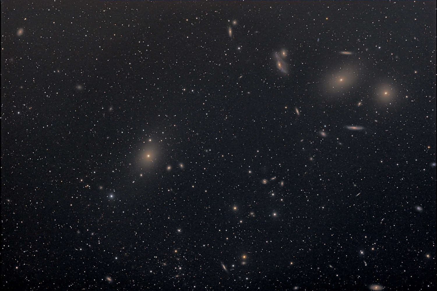 The Virgo Galaxy Cluster in the region of M87; Virgo A wide-field view of part of what is arguably the finest nearby galaxy cluster in the sky containing an estimated 2000 members. This view contains the giant elliptical M87 (left of centre), most of the galaxies making up Markarian's Chain (featuring M86 and M84, upper right), NGC4531 (upper left) and NGC4371 (bottom right), the beautiful little face-on barred spiral, NGC4440 (below centre) and dozens of other cluster members and numerous more distant galaxies. Note the interacting pair of NGC4438 (very distorted) and NGC4435. distance ~55Mly. Here are close-ups of M87, M86 and NGC 4438 taken from the image below.
