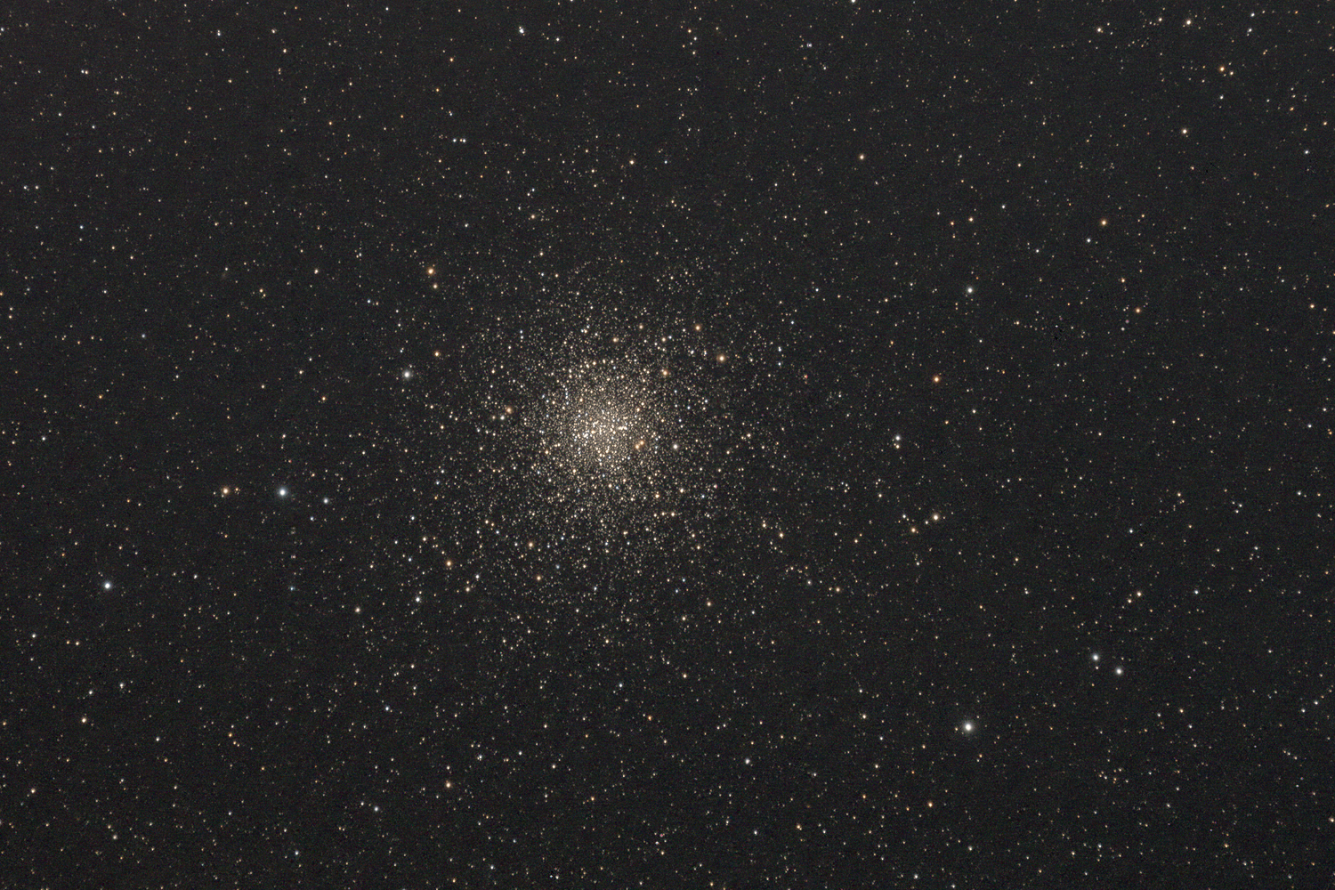M4 Located in the direction of Scorpius just 1.3° from Antares, it is the closest globular cluster to the solar system at just 6,000 ly distant, is approximately 70 ly across and has an unusual "bar" structure across the core. While close, its light has been attenuated by considerable dust and gas along the line of sight giving its stars a rich yellow-orange colour. Relatively metal-poor (ie contains few elements heavier than helium) it has a mass of about 8.4x104 solar masses. Classified, IX (loose towards the centre), on the Shapley-Sawyer globular cluster concentration scale (1927).