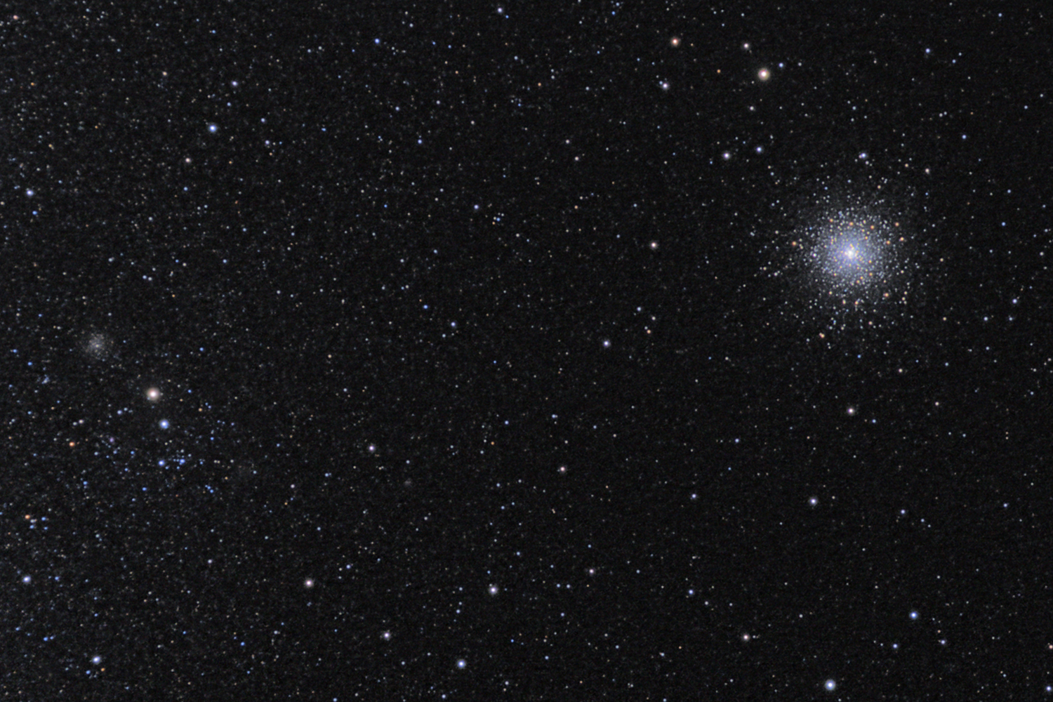 NGC 362 Located at a distance of about 29,300 ly from Earth in the direction of Tucana a little to the north of the Small Magellanic Cloud (SMC), to which it is entirely unrelated. Outlying stars and clusters of the SMC can be seen on the left side of the image. It is believed to be relatively young (as globular clusters go) in view of its higher metallicity compared with other similar objects. Studies of its densely-packed central region have revealed an overabundance of binary stars perhaps suggestive of core collapse in the past. Classified as III (strong inner core of stars) on the Shapley-Sawyer globular cluster concentration scale (1927).