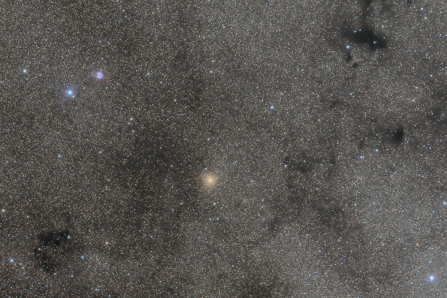 NGC 6440 Located in a rich field of stars and nebulae in the direction of Sagittarius, it lies about 27,700 ly from Earth. The rich yellow colour of its stars is not indicative of stellar age, however, but of substantial extinction during the light's long passage though the dense inner regions of our galaxy. Also in the field, in addition to the countless stars, are numerous dark nebulas including B84 at upper right and a nice planetary nebula, NGC 6445, to the upper left. Classified as V (intermediate concentrations) on the Shapley-Sawyer globular cluster concentration scale (1927).