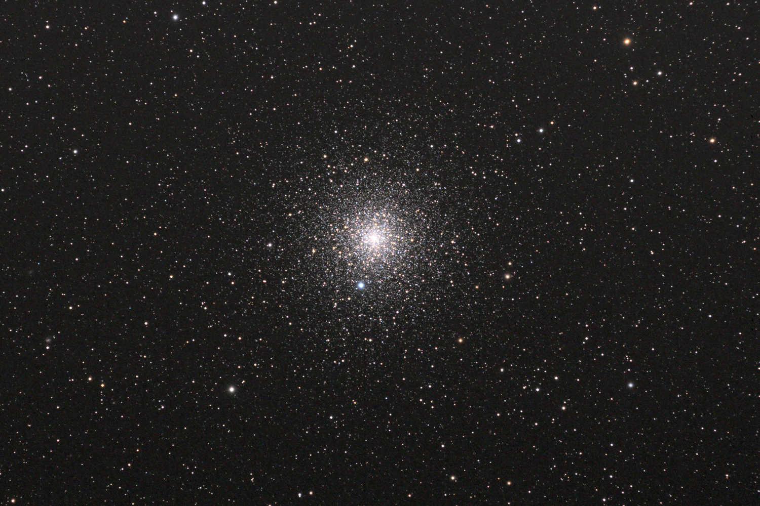 NGC 6752: Globular Cluster in Pavo In apparent size, NGC 6752 is arguably the third largest globular cluster after Omega Centauri and 47 Tucanae (all southern objects!). One of the closest globulars at just 13,000ly away, it is a lovely object viewed through a 15cm or larger telescope having a moderately condensed core (about 3arcmin in diameter) and unusually bright outliers to around 15arcmin: photographically it is about 42arcmin in diameter. It has a mass of around 1.4x105 solar masses and is classified as VI (intermediate mild concentration towards the centre) on the Shapley-Sawyer globular cluster concentration scale (1927). This photograph reveals the delicate star colours, predominantly yellows with some reds and blues (closer view). In addition to NGC 6752 and the colourful stars of our own galaxy the field contains many distant galaxies with discernable structures: among the 20 or more galaxies visible are the trio of spiral galaxies upper left, an interacting system to the right of these, an edge-on spiral lower left and a curious edge-on ribbon galaxy middle right.
