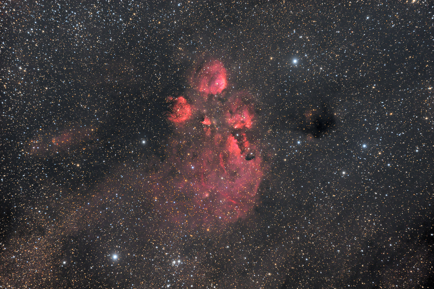 The Cats Paw Nebula, NGC 6334 Located near the sting of the Scorpion's tail, this object is well-named, as it does resemble the paw of a celestial cat that left its mark on the sky after dipping a paw in a tin of luminous red paint. It is a complex of emission nebulae and dark dust clouds amidst a field strewn with stars. Distance ~ 5500 ly. The dark nebula is B257.