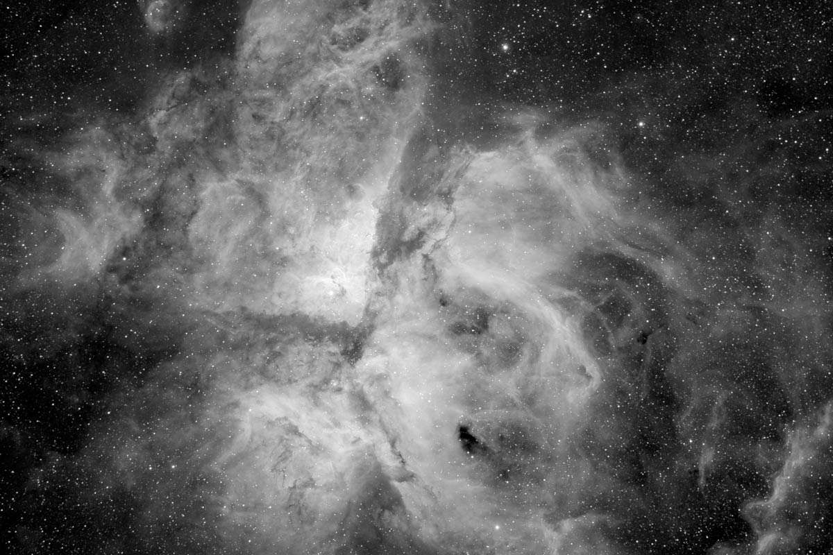 Eta Carina Nebula, NGC 3372, in Ha - the awesomely detailed nebula around h Carinae (distance ~7500ly), one of our Southern Sky gems. Here it is imaged in Ha light from light-polluted skies of my apartment balcony close to the Melbourne CBD.